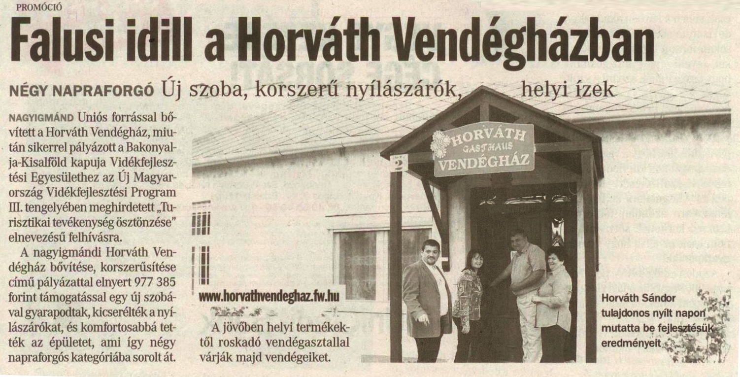 A Horváth Vendégház 2011-ben az Új Magyarország Vidékfejlesztési Program keretében valósította meg a szálláshelyek bővítését és korsze- rűsítését. |